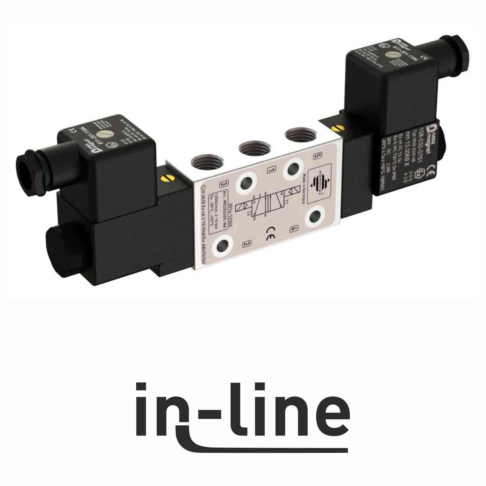 Le nostre elettrovalvole In-line sono adatte all’installazione centrale in box di controllo o assemblaggio su attuatori lineari, valvole inclinate o valvole a ghigliottina. Con le nostre elettrovalvole bistabili differenziamo tra 5/2 e 5/3 vie con il centro di posizionamento optional; chiuso, areato o de-areato.