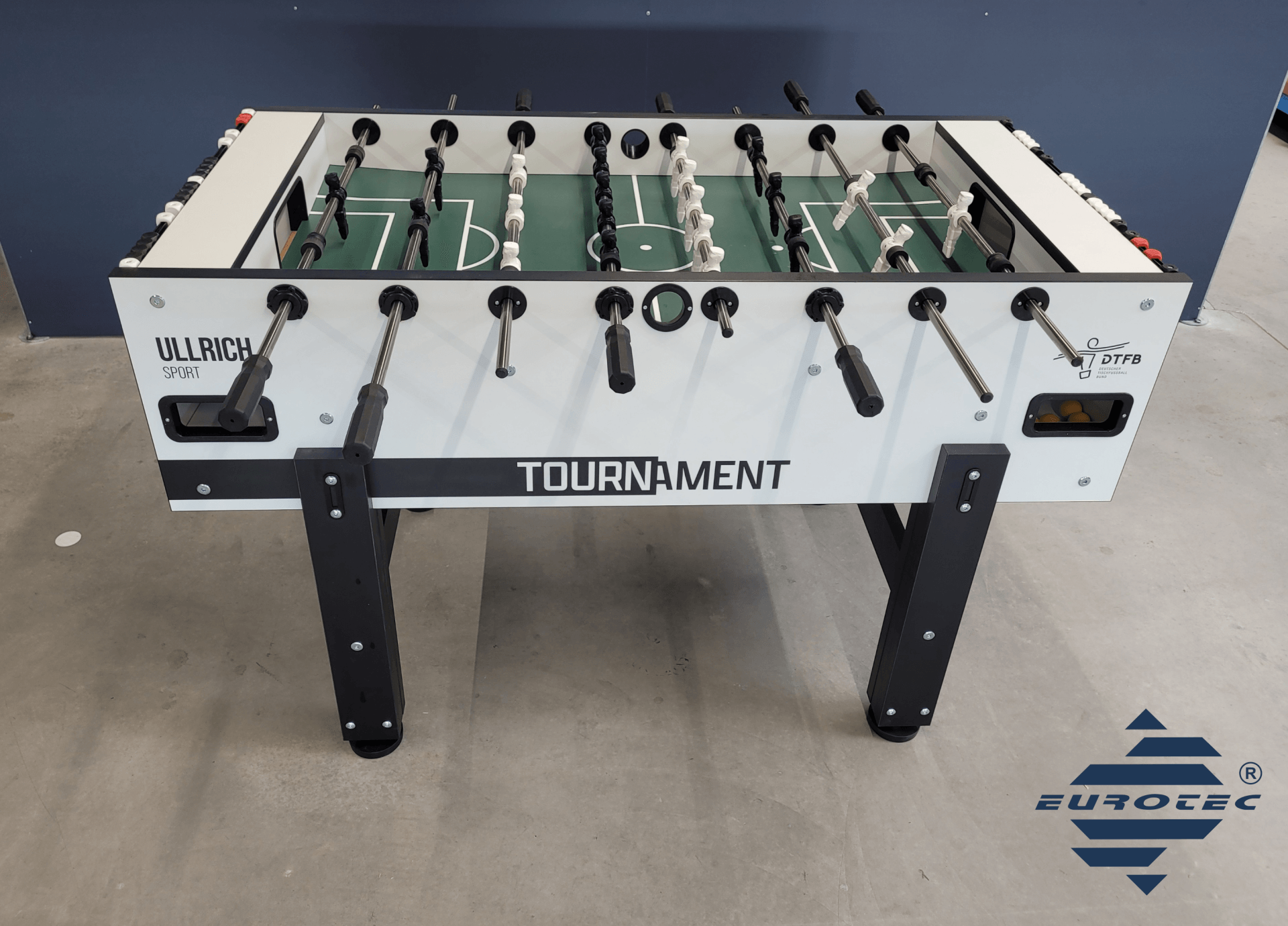 (EN) Table soccer has always been a popular break activity at EUROTEC. When the well-known distance regulations came into effect some time ago and our employees increasingly worked from their home offices, the old table, which was getting on in years anyway, was disposed of. Now it was time for a new table soccer, which we found at Ullrich Sport with the model "Tournament" and on which certainly the one or other tournament will be held. Thanks to Ullrich Sport for the fast delivery!
