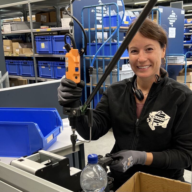 (EN) "What are you doing here? " - "Manufacturing"…and our CEO, Melissa Berge, smiles. She is testing the new assembly benches and equipments provided by Knut Berge for our production facilities, and thrilled with them. "That makes the work definitely much easier".
